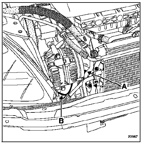 Reposer les deux tuyaux de réfrigérant R134a (A) (couple de serrage : 2,1 daN.m) sur le compresseur ainsi que la patte (B).